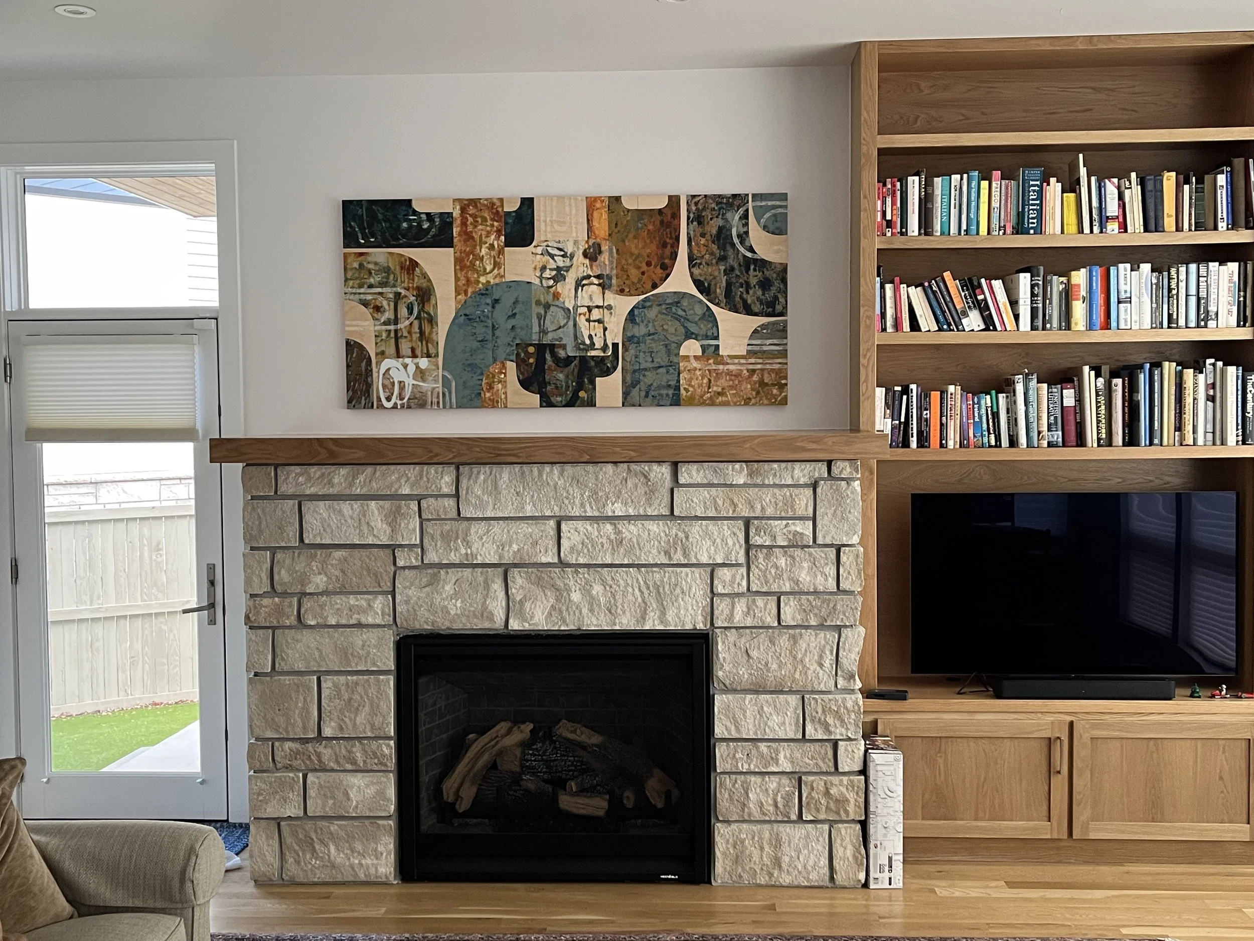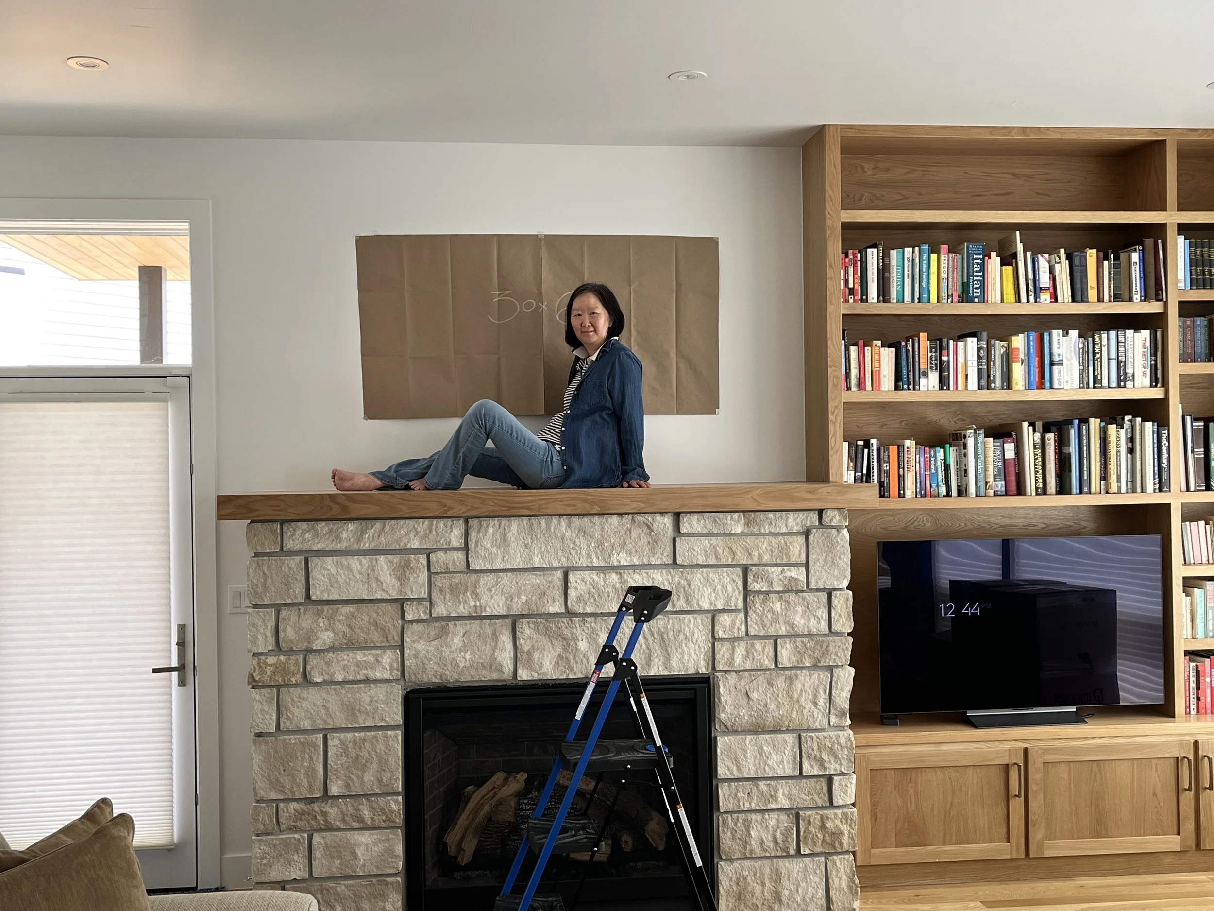 Our commission team included another college classmate and interior designer Howard Stolar, whose astute observations and input in our design reviews were invaluable to my creative process. Howard had guided Irene to a custom work for the heart of their home, for the ability to be specific with dimensions. We worked with photographs of the tricky setting, did math and used best practices to helping guide scale, proportion and orientation – because I did not want to make a mistake in sizing the beautiful hardwood panels that would become the focus of the room. To boost my confidence and gain client buy-in, I shipped my client several Kraft paper sizing templates to hang in place, then photograph from several places in the room. As you can see from this photo, yes, my friend is petite, but I would not have been able to guess how substantial the hearth and mantel were in this room! Safely shipping the weighty panels from Seattle was both a learning experience and a team effort, navigating crating, shipping, and “unboxing” at their destination.